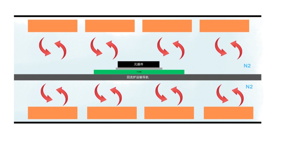 原理:在熱風(fēng)回流焊的基礎(chǔ)上,氮?dú)饣亓骱讣訜徇^程中會(huì)向爐膛內(nèi)充氮?dú)廨o助焊接
