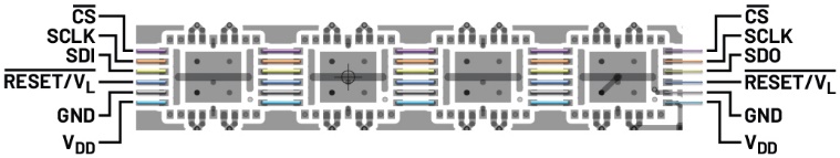 當(dāng)系統(tǒng)中使用多個(gè)器件時(shí),借助直通引腳特性可以實(shí)現(xiàn)更緊湊的布局并提高通道密度。此特性有助于電源和數(shù)字線(xiàn)路在器件之間無(wú)縫傳輸。封裝的頂部和底部引腳均提供VDD、RESET/VL、GND電源線(xiàn)和SCLK、CS、SDI、SDO數(shù)字線(xiàn)。直通引腳簡(jiǎn)化了PCB布線(xiàn),并減少了連接多個(gè)器件時(shí)對(duì)過(guò)孔的需求。圖3展示了一個(gè)PCB布局示例,其中四個(gè)以菊花鏈模式配置的ADGS2414D器件利用直通引腳特性,使布局的整體尺寸大大縮小。