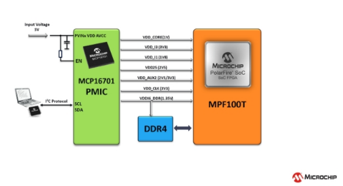 MCP164GX1000:給PIC64GX1000 MPU + DDR4供電的框圖