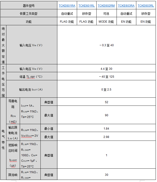 TCKE6系列包括配備了FLAG功能的產(chǎn)品(用于檢測并報(bào)告異常情)以及配備了EN(使能)功能的產(chǎn)品(用于控制eFuse IC運(yùn)行)。自動重試型(eFuse IC自動恢復(fù)電路)和鎖存型(通過外部信號觸發(fā)恢復(fù))。此外,其中一款產(chǎn)品不包含F(xiàn)LAG或EN功能,但支持通過外部信號在自動重試和鎖存模式之間進(jìn)行模式切換。這種靈活性使用戶能夠根據(jù)其系統(tǒng)要求和設(shè)備尺寸選擇最合適的產(chǎn)品。