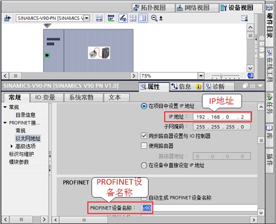 在“設(shè)備視圖”界面中選擇SINAMICS V90模塊,在“屬性”選項卡中,單擊“常規(guī)”→“PROFINET接口”,查看IP地址和PROFINET設(shè)備名稱,如圖8所示。