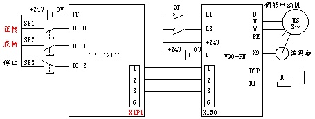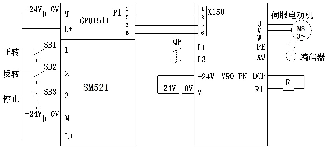 以CPU 1211C為控制器的原理圖如圖1所示,以CPU 1511-1 PN為控制器的原理圖如圖2所示,CPU 1211C的PN接口(X1P1)與SINAMICS V90伺服驅(qū)動器PN接口(X150)之間用專用的以太網(wǎng)屏蔽電纜連接。網(wǎng)線為直通線,即正連接。CPU 1511-1 PN的PN口是P1口或P2口均可。