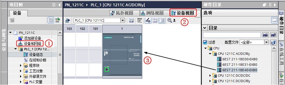 (1)新建項目“PN_1211C”,如圖3所示,在項目樹中單擊“設(shè)備”→“PN_1211C”→“設(shè)備和網(wǎng)絡(luò)”→“設(shè)備視圖”,在硬件目錄中,單擊“CPU”→“CPU 1211C AC/DC/Rly”→“6ES7 211 -1BE40-0XB0”,并將其拖拽到“設(shè)備視圖”界面中相應(yīng)的位置。