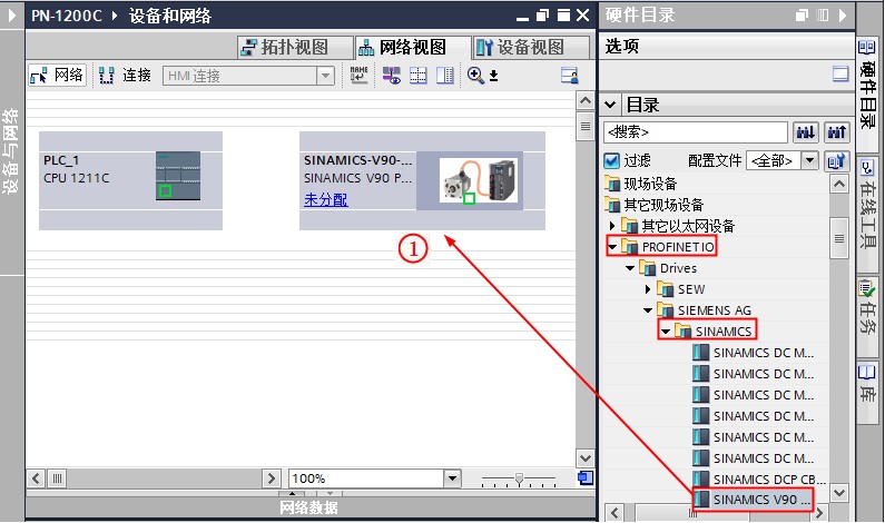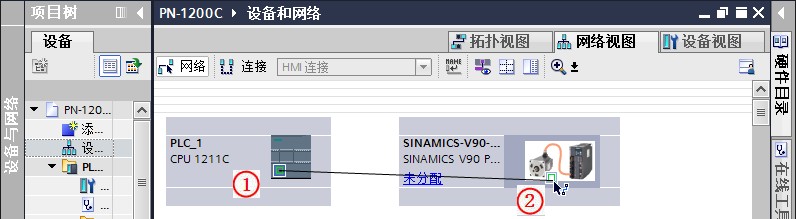 (4)配置SINAMICS V90伺服驅(qū)動器。展開右側(cè)的硬件目錄,選中“其他現(xiàn)場設(shè)備”→“PROFINET IO”→“Drives”→“SIEMENS AG”→“SINAMICS”→“SINAMICS V90…”,拖拽“SINAMICS V90”到“網(wǎng)絡(luò)視圖”界面中相應(yīng)的位置,如圖5所示。在圖6中,單擊“網(wǎng)絡(luò)視圖”界面中PLC_1 CPU 1211C模塊的綠色標(biāo)記(PLC的PROFINET接口)處并按照鼠標(biāo)左鍵不放,拖拽到SINAMICS V90模塊的綠色標(biāo)記(SINAMICS V90的PROFINET接口)處,松開鼠標(biāo)左鍵。
