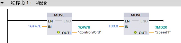 注意:PLC側(cè)選擇標(biāo)準(zhǔn)報文1,那么伺服驅(qū)動器側(cè)也要選擇報文1。標(biāo)準(zhǔn)報文1的控制字是QW78,主設(shè)定值是QW80。這里“78…81”代表QB78~QB81共4個字節(jié),也就是QW78和QW80共2個字。