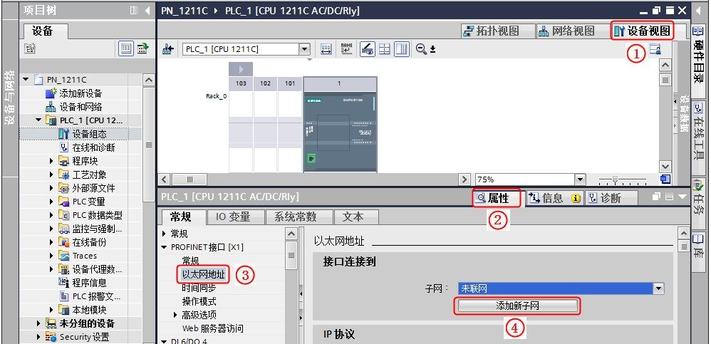 (2)配置PROFINET接口。在“設(shè)備視圖”界面中選中“CPU1211C”的圖標(biāo),打開“屬性”選項卡,單擊“常規(guī)”→“PROFINET接口[X1]”→“以太網(wǎng)地址”,單擊“添加新子網(wǎng)”按鈕,新建PROFINET網(wǎng)絡(luò),如圖4所示。