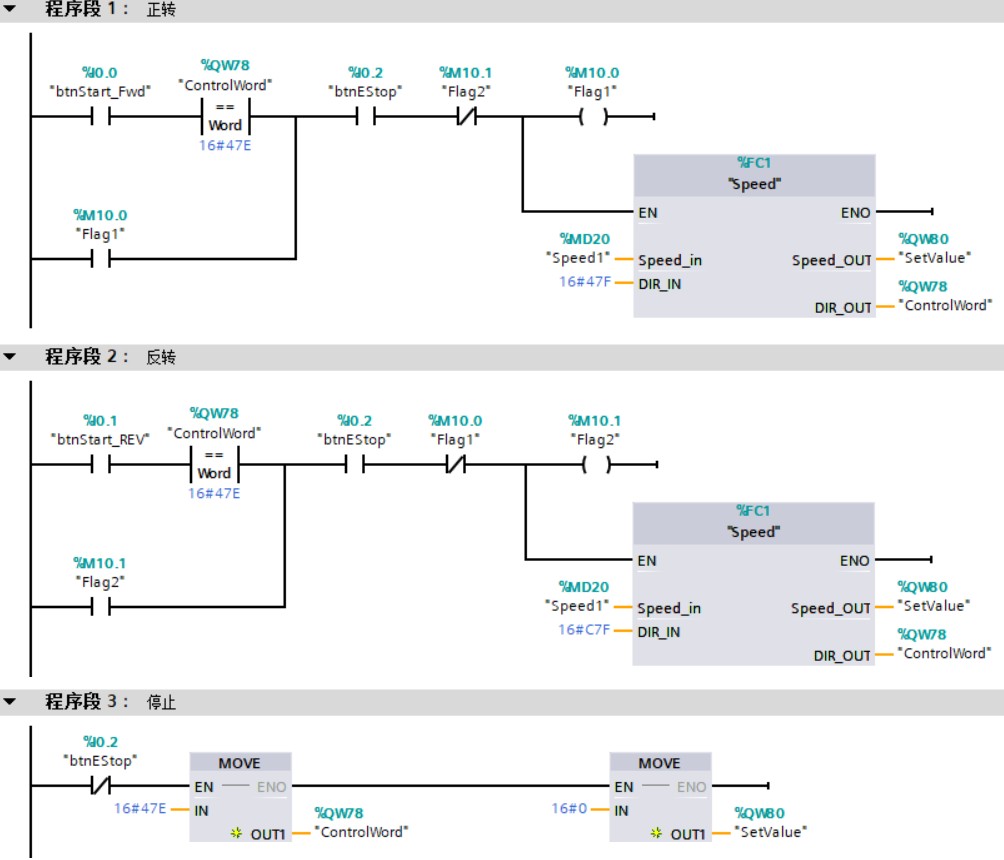程序段1:正轉(zhuǎn)控制,當(dāng)處于停機狀態(tài)時,按下正轉(zhuǎn)起動按鈕,電動機正轉(zhuǎn)。