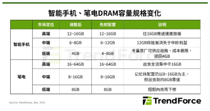 TrendForce集邦咨詢指出,“縮減規(guī)格配置”或“暫緩升級”已成智能手機、筆電品牌平衡成本的一項必要手段,其中以成本占比較高的DRAM修正較明顯。預料高階、中階產品的DRAM容量規(guī)格將分別向該市場的最低標準集中,放緩提升速度。至于低階市場則是受創(chuàng)最深的價格帶,以手機為例,2026年退回以4GB為主;低價筆電因受限于處理器搭配及操作系統(tǒng)需求,DRAM配置短期內難再下修。