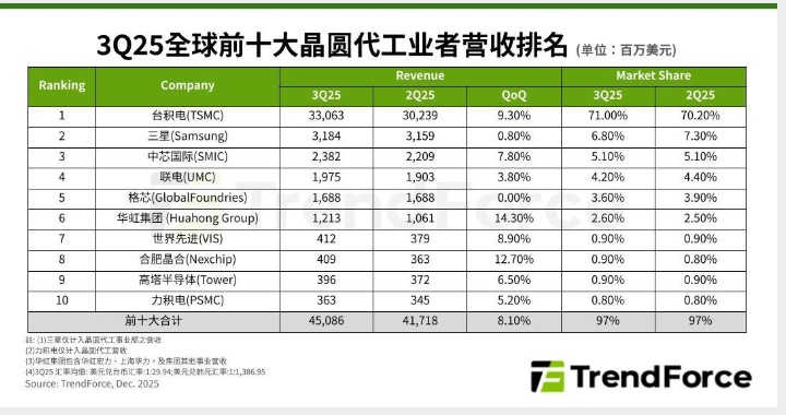 TrendForce集邦咨詢: 在消費(fèi)性電子與AI新品驅(qū)動(dòng)下,2025年第三季度前十大晶圓代工產(chǎn)值季增8.1%