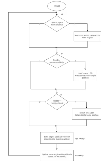 為了發(fā)送命令,我們創(chuàng)建了一個代碼列表,由不同的字母組成,這意味著不同的事情。每個代碼都與一個字母或數(shù)字相匹配,通過藍(lán)牙通信發(fā)送到手臂上。