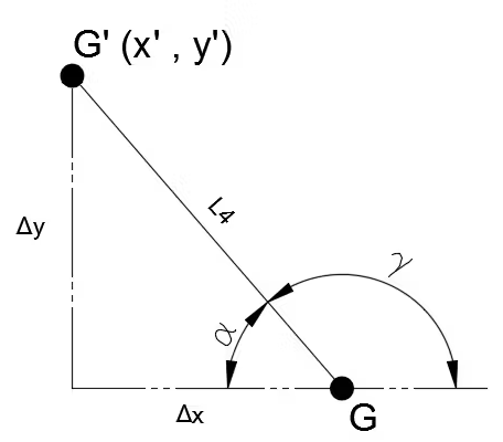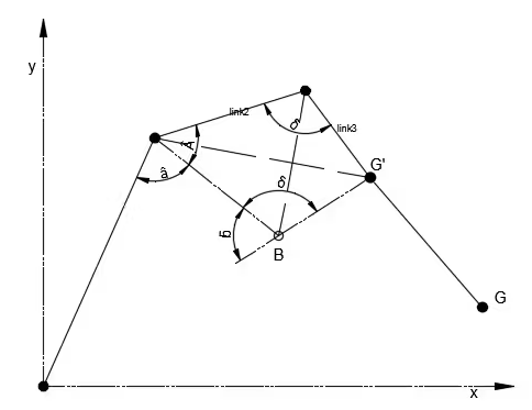 然后我們可以畫一個圓心為G'的圓,半徑等于連桿3的長度。我們知道圓的方程,所以我們可以求直線的交點,ATB點。