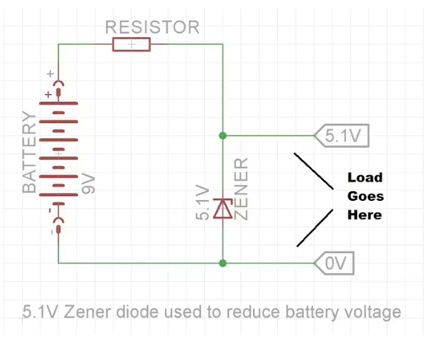 上圖是齊納二極管的典型用法。選擇電阻器值來(lái)限制流過(guò)二極管的電流。使用歐姆定律,如果齊納二極管被設(shè)計(jì)為耗散最大1/2瓦,可以流過(guò)它的最大電流是0.5 / 5.1 = 98mA。電阻器需要下降3.9 v,因此電阻器值為3.9 / 0.098 = 39.8歐姆。這是電阻器的最小值。當(dāng)電流被負(fù)載使用時(shí),流過(guò)齊納二極管的電流更少。