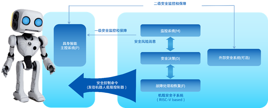 此外,《白皮書》引入了PMDF安全架構(gòu),旨在系統(tǒng)性地管理風(fēng)險(xiǎn),確保機(jī)器人系統(tǒng)在各種復(fù)雜情況下的安全運(yùn)行。該架構(gòu)將帶有安全功能的機(jī)器人系統(tǒng)按功能劃分為四個(gè)邏輯上相互獨(dú)立的模塊,分別是具身智能主控系統(tǒng)(P)、監(jiān)控系統(tǒng)(M)、安全決策(D)和故障處理和恢復(fù)(F)。M、D、F三個(gè)模塊組成一個(gè)安全子系統(tǒng),可通過RISC-V等單獨(dú)的硬件實(shí)現(xiàn),既能保障高安全性,又可以直接放在機(jī)器人本體上部署。各模塊之間協(xié)同合作,共同構(gòu)建起堅(jiān)實(shí)的安全防線。