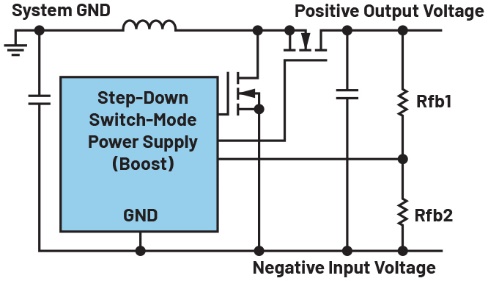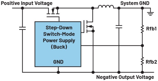 然而,有時電壓需要反相。在大多數(shù)情況下,需要將正電源電壓轉(zhuǎn)換為負電壓。這是為了給信號路徑中的傳感器供電,使其能夠處理具有正負電壓偏轉(zhuǎn)的信號。例如,+5V和-5V用作運算放大器的電源,以處理信號電壓。某些應用需要負電壓來安全關斷MOSFET的柵極。要從現(xiàn)有正電壓產(chǎn)生負電壓,圖1所示的反相拓撲是合適的方案。其中,正電壓被轉(zhuǎn)換為負電壓。這種電路結(jié)構(gòu)簡單,不需要變壓器,可以利用標準降壓型開關穩(wěn)壓器IC構(gòu)建。降壓型穩(wěn)壓器的輸出電壓連接至系統(tǒng)接地端,GND引腳電壓產(chǎn)生負電壓,該負電壓可通過電阻分壓器Rfb1和Rfb2進行調(diào)節(jié)。