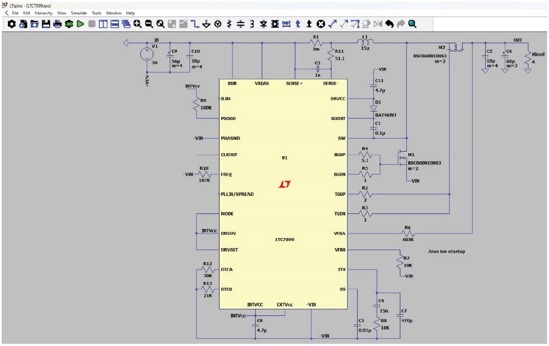 為了在較高功率下也能實現(xiàn)平穩(wěn)的切換,可以使用專用開關穩(wěn)壓器IC來有效完成從負電壓到正電壓的轉(zhuǎn)換。LTC7899就是這樣的IC。它是一款開關電源升壓轉(zhuǎn)換器控制器,專為將負電壓轉(zhuǎn)換為正電壓而設計。它使用外部開關,而且同步工作,并在輸入和輸出之間提供高達135 V的極寬電壓范圍。圖3顯示了仿真程序LTspice®中的LTC7899反相電路實現(xiàn)方案,用戶可借助該軟件對電路進行仿真分析。