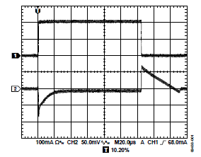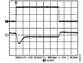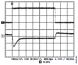 輸出電容還會影響負(fù)載電流變化的瞬態(tài)響應(yīng)。采用較大的輸出電容值可以改善LDO對大負(fù)載電流變化的瞬態(tài)響應(yīng)。圖1至3所示為輸出電容值分別為1 μF、10 μF和20 μF的ADP151的瞬態(tài)響應(yīng)。
