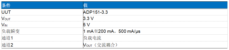 因?yàn)長DO控制環(huán)路的帶寬有限,因此輸出電容必須提供快速瞬變所需的大多數(shù)負(fù)載電流。1 μF電容無法持續(xù)很長時間供應(yīng)電流,會產(chǎn)生約80 mV的負(fù)載瞬變。10 μF電容將負(fù)載瞬變降低至約70 mV。將輸出電容提高至20 μF,LDO控制回路就能快速響應(yīng)并主動降低負(fù)載瞬變。測試條件如表1所示。