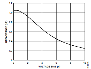 本例中,假定X5R電介質(zhì)在?40°C至+85°C范圍內(nèi)的最差情況電容(TVAR)為0.15(15%)。假設(shè)電容容差(TOL)為0.10 (10%),CBIAS在1.8 V下為0.94 μF,如圖4所示。