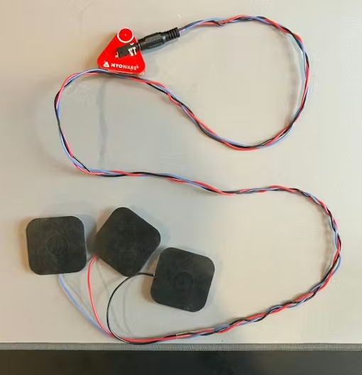 ?按照MyoWare推薦的配置將電極墊貼在股四頭肌上:沿著肌肉放置兩個(gè)活動(dòng)電極墊,附近放置一個(gè)參考/地面電極墊。
