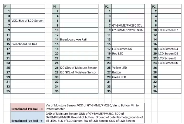 所有PocketBeagle引腳(P1和P2)到組件引腳(無(wú)論是在組件上還是在面包板上)都被捕獲在下面以方便參考。當(dāng)我測(cè)試我的系統(tǒng)時(shí),這些pin是根據(jù)PocketBeagle的響應(yīng)情況決定的。