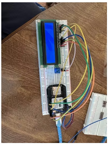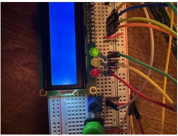 我使用電位器作為分壓器來(lái)控制LCD對(duì)比度,中間引腳連接到LCD的VO引腳,一側(cè)連接到3.3 V,另一側(cè)連接到地。然后我通過(guò)轉(zhuǎn)動(dòng)鍋手動(dòng)調(diào)整對(duì)比度,而液晶顯示器是用我的電腦供電的。布線類似于下面的圖3(注意,由于初始引腳連接無(wú)響應(yīng),在此迭代之后,布線發(fā)生了變化,但是為了方便視覺(jué),插入了圖像)。