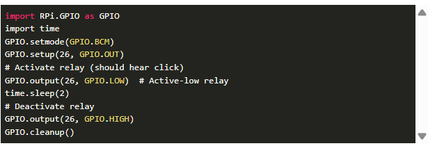 一旦連接,使用這個(gè)小腳本測(cè)試?yán)^電器(你應(yīng)該聽到一聲點(diǎn)擊):