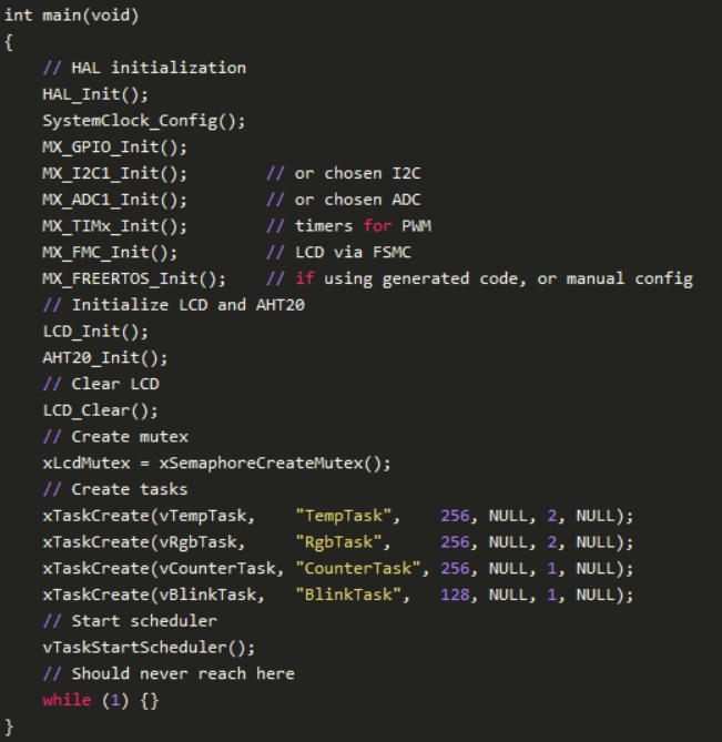 LCD是在任務(wù)之間共享的,因此使用互斥鎖來(lái)保護(hù)獨(dú)占訪問(wèn)。所有任務(wù)都在無(wú)限循環(huán)中運(yùn)行,并在每次更新后延遲自己,以便其他任務(wù)可以運(yùn)行。