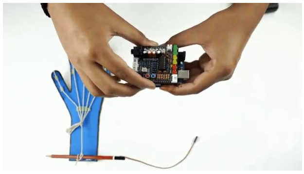 現(xiàn)在粘貼一個鉛筆在伺服電機(jī)的頂部,并將所有5螺紋通過一個小螺紋到鉛筆上,如圖所示。