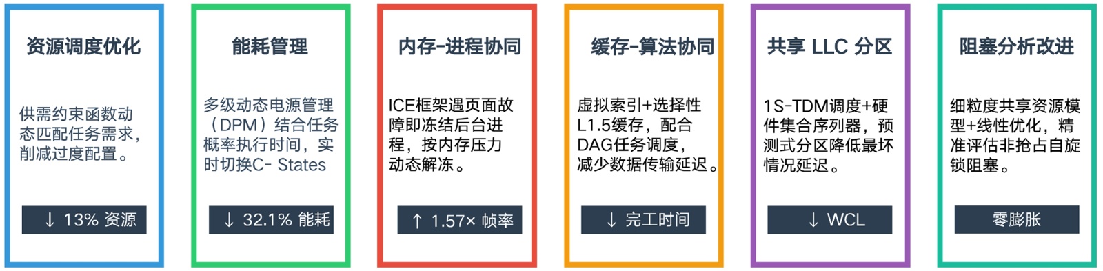 Mamata等人[16]提出了一種面向資源優(yōu)化的調(diào)度模型,以最小化實時嵌入式系統(tǒng)中的資源過度配置。該方法利用供需約束函數(shù)優(yōu)化資源分配,在保證任務時限的同時,平均減少了13%的資源使用量。Reghenzani等人[17]提出了一種多級動態(tài)電源管理(DPM)策略,以優(yōu)化異構(gòu)處理器上實時有向無環(huán)圖任務的能耗。該方法結(jié)合任務概率執(zhí)行時間分析,動態(tài)調(diào)整處理器C-States,在保證硬實時約束的前提下,實現(xiàn)了最高32.1%的能耗降低,并通過仿真和實測驗證了優(yōu)化效果。Li等人[18]提出了一種協(xié)作式內(nèi)存和進程管理框架ICE。ICE通過在內(nèi)存頁面故障時凍結(jié)后臺進程,并基于內(nèi)存壓力動態(tài)解凍,從而有效減少后臺應用引發(fā)的內(nèi)存故障,提升了1.57倍的幀率和減少了交互警告。Jiang等人[19]提出了一種面向并行實時系統(tǒng)的緩存與算法協(xié)同設計方案。該研究引入了一種虛擬索引、物理標記、選擇性包含的L1.5緩存,并提出了針對有向無環(huán)圖任務的調(diào)度方法,以減少數(shù)據(jù)傳輸延遲并降低任務完工時間。Wu等人[20]提出了一種預測性共享最后級緩存(LLC)分區(qū)的方法,方法采用了1S-TDM調(diào)度策略并結(jié)合硬件擴展集合序列器,顯著降低了最壞情況延遲(WCL),提高了共享緩存分區(qū)的利用效率。Chen等人[21]提出了一種基于細粒度共享資源模型的改進阻塞分析方法,解決并行實時任務中非搶占式自旋鎖的阻塞問題。方法通過線性優(yōu)化技術(shù)實現(xiàn)了無膨脹分析,避免了傳統(tǒng)分析中的過度表示。