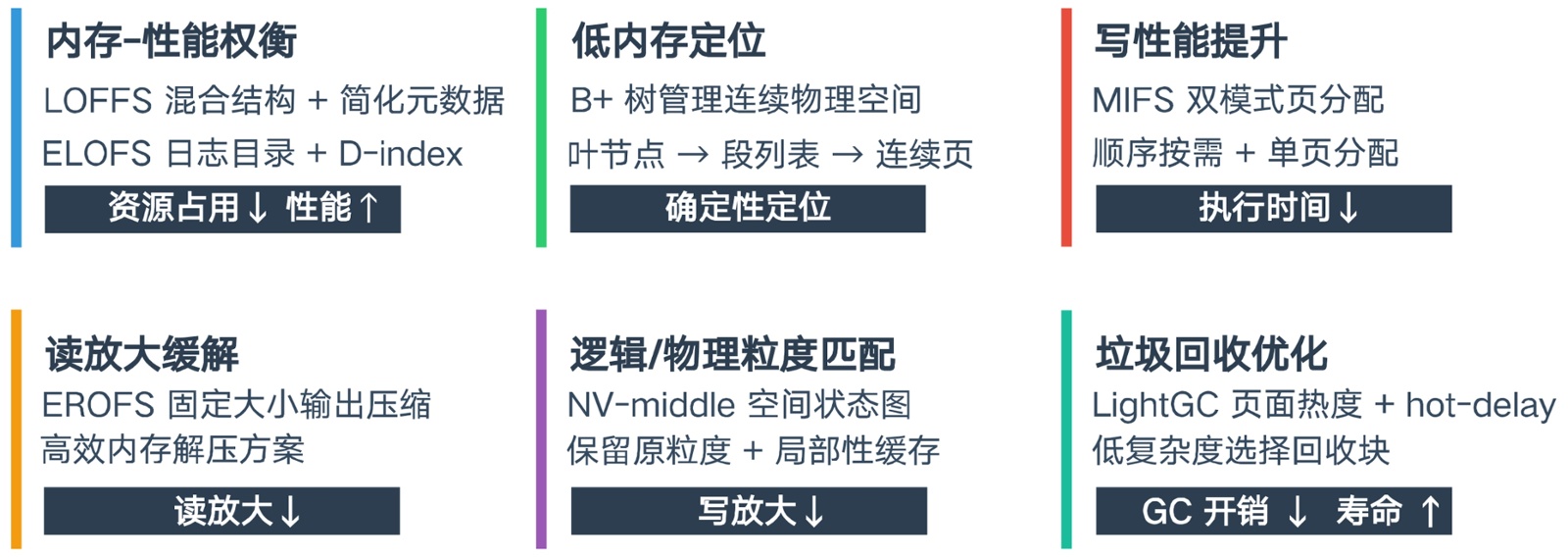 嵌入式設備具有存儲資源受限、計算能力有限、成本敏感等特點,導致嵌入式系統(tǒng)在文件系統(tǒng)設計方面面臨重大挑戰(zhàn)?,F(xiàn)有研究從空間管理粒度與元數(shù)據(jù)精簡、數(shù)據(jù)結(jié)構(gòu)與頁分配優(yōu)化、壓縮/緩存以抑制讀寫放大、以及高效垃圾回收策略等方向展開,如圖4所示。
