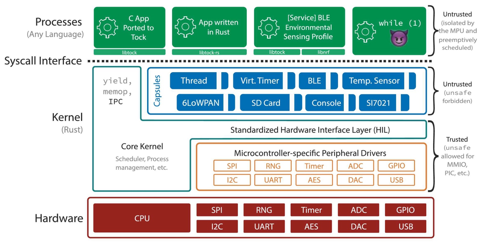 與此同時(shí),Rust語言因其高效且安全的特性,對(duì)嵌入式操作系統(tǒng)有較大應(yīng)用價(jià)值。TockOS [26]是由Rust實(shí)現(xiàn)的嵌入式實(shí)時(shí)操作系統(tǒng),保證必要的不安全操作(如直接硬件寄存器訪問)被明確標(biāo)記并封裝于受信任的驅(qū)動(dòng)模塊中,縮小了潛在危險(xiǎn)代碼范圍,其具體內(nèi)核安全區(qū)劃分如圖3所示。清華大學(xué)團(tuán)隊(duì)以Rust為基礎(chǔ)語言研發(fā)的ArceOS [27]可以快速定制適配不同場(chǎng)景的內(nèi)核。ArceOS僅需新增幾千行代碼,即可實(shí)現(xiàn)功能完善的宏內(nèi)核StarryOS [28],而替換插件為vCPU管理模塊后,又能快速形成Hypervisor AxVisor [29],其應(yīng)用Rust進(jìn)行的開發(fā)設(shè)計(jì)兼顧了內(nèi)核的性能、安全性與可移植性。