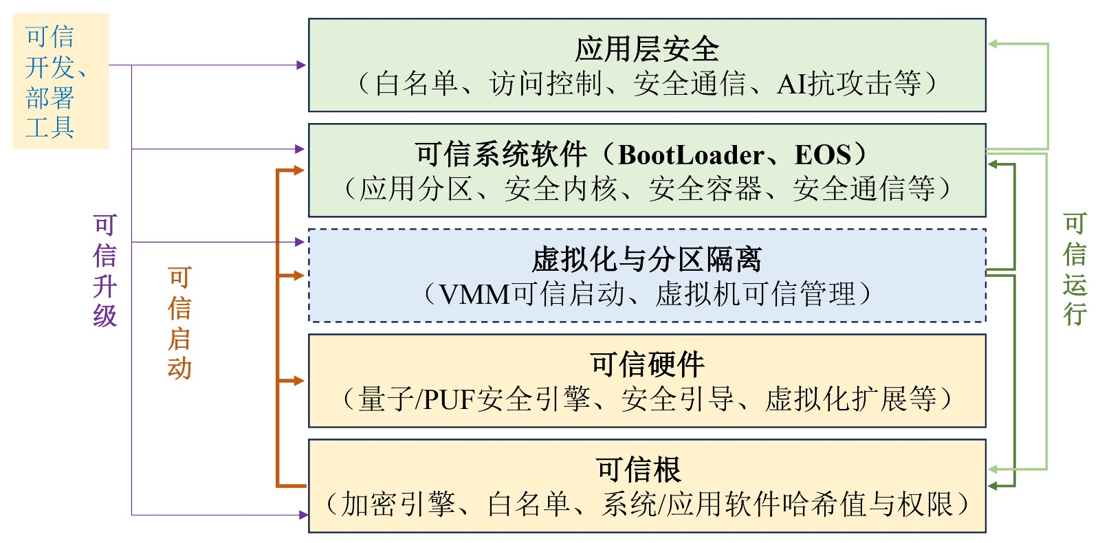 圖1所示為面向嵌入式系統(tǒng)的可信技術(shù)體系。該體系構(gòu)建了一個從底層硬件根基到上層應(yīng)用安全的垂直信任鏈條。其基礎(chǔ)始于最下層的可信根,該層內(nèi)置了加密引擎和白名單管理等核心安全功能;在此之上構(gòu)建可信硬件層,集成了量子安全引擎或PUF等物理級安全防護(hù)機(jī)制;向上延伸至虛擬化與分區(qū)隔離層,通過可信的虛擬機(jī)監(jiān)視器(VMM)啟動和管理機(jī)制,確保不同計算環(huán)境之間的嚴(yán)格隔離;進(jìn)一步加固可信系統(tǒng)軟件層,包含安全的BootLoader引導(dǎo)程序等組件,為上層運(yùn)行提供可信軟件基礎(chǔ);最終抵達(dá)頂層的應(yīng)用安全層,實施如應(yīng)用白名單等機(jī)制,保障具體應(yīng)用程序的可信執(zhí)行。在整個可信技術(shù)體系中,可信開發(fā)部署工具涵蓋從可信根到軟件層面,提供安全的開發(fā)框架與工具鏈,確保所有組件在開發(fā)階段即內(nèi)嵌安全能力,并在部署時按預(yù)期運(yùn)行??尚派壱蕾嚳尚鸥鎯Π姹驹獢?shù)據(jù),并在升級后驗證新組件的完整性,保障系統(tǒng)可持續(xù)演進(jìn),避免升級成為安全突破口。而可信啟動則是自下而上逐步構(gòu)建的,可確保系統(tǒng)從啟動伊始即處于已知可信狀態(tài),抵御Bootkit等底層攻擊。可信運(yùn)行是在系統(tǒng)啟動完成后,通過技術(shù)手段保障系統(tǒng)在持續(xù)運(yùn)行過程中始終處于安全可信狀態(tài)的動態(tài)防護(hù)機(jī)制。