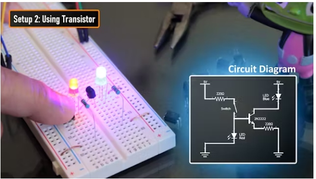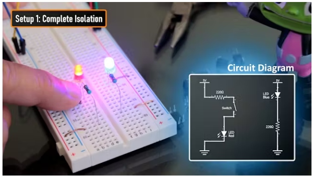 初始配置包括在面包板上組裝的兩個(gè)電路。電路1和電路2是電隔離的,這意味著其中一個(gè)的操作對(duì)另一個(gè)沒(méi)有影響。通電后,電路2上的LED立即亮起。相比之下,電路1上的LED由開(kāi)關(guān)控制,只有在激活時(shí)才發(fā)光。激活Circuit1中的開(kāi)關(guān)將點(diǎn)亮其LED,而Circuit2中的LED始終保持點(diǎn)亮,不受左邊電路的影響。