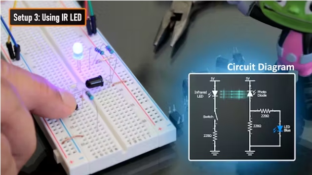 在接下來(lái)的設(shè)置中,我使用紅外LED和紅外接收器來(lái)創(chuàng)建我自己的光隔離器。電路1(左)包含紅外發(fā)射器和開(kāi)關(guān),電路2(右)包含紅外接收器和紅外信號(hào)檢測(cè)時(shí)亮起的指示LED。撥動(dòng)開(kāi)關(guān)打開(kāi)紅外LED。紅外接收器然后檢測(cè)到這個(gè)信號(hào),并通過(guò)照亮它的指示LED作出反應(yīng)。雖然可以手動(dòng)設(shè)計(jì)紅外電路,但PC817光耦合器提供了一個(gè)完全預(yù)先設(shè)計(jì)的解決方案,具有緊湊的內(nèi)置集成電路。