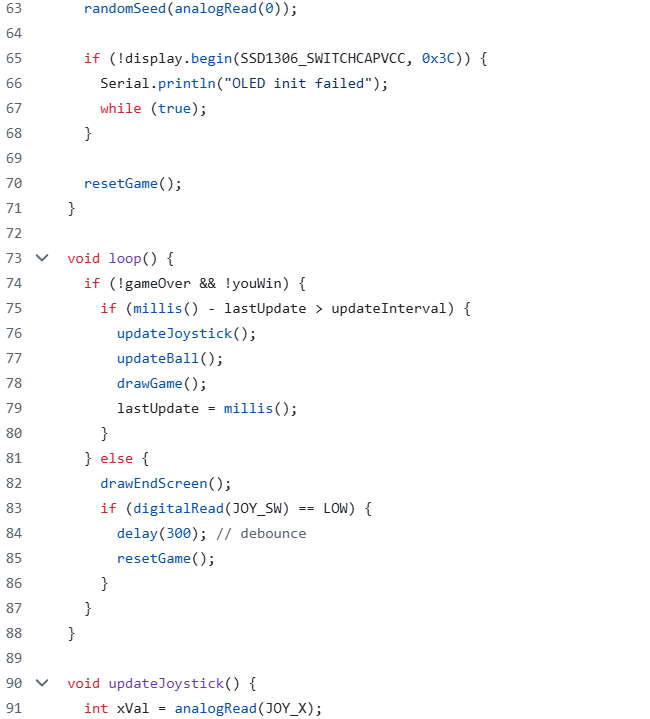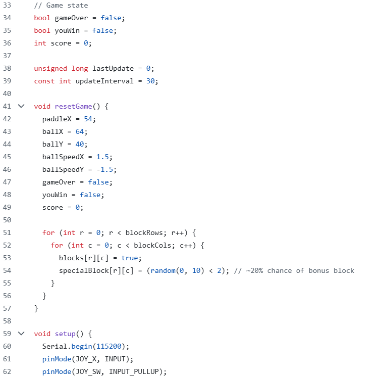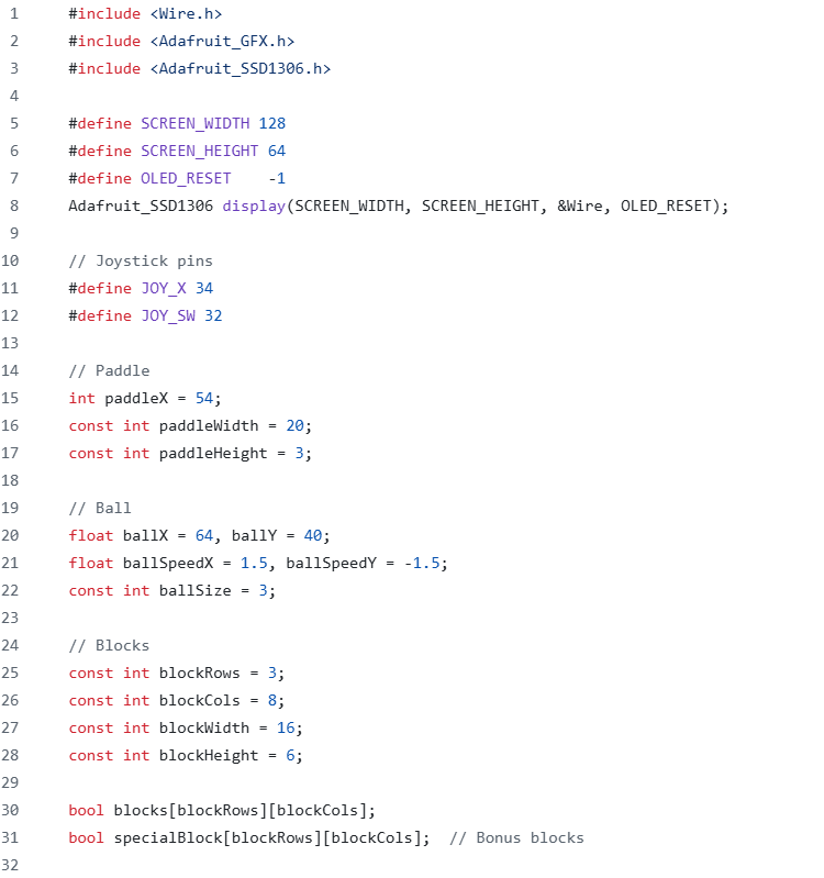 我想用ESP32打造一款手持游戲體驗(yàn)。該項(xiàng)目重現(xiàn)了經(jīng)典的“破磚機(jī)”(Breakout)機(jī)制,并針對(duì)小型OLED屏幕進(jìn)行了優(yōu)化。它包括一個(gè)由模擬操縱桿控制的反應(yīng)槳和一個(gè)隨機(jī)評(píng)分系統(tǒng),其中一些塊的價(jià)值比其他塊高5倍。