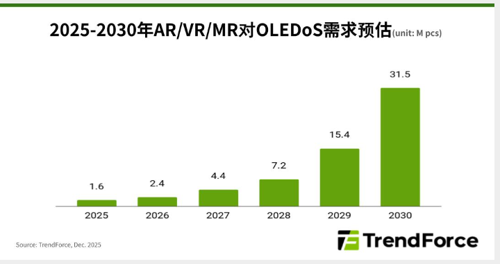 Dec. 29, 2025 ---- 視涯科技(SeeYA)IPO申請近日獲得上海市證券交易所審核通過,擬募資20.15億元人民幣,用于擴建OLEDoS 顯示器產(chǎn)線與研發(fā)中心。根據(jù)TrendForce集邦咨詢統(tǒng)計,AR、VR、MR等近眼顯示裝置對OLEDoS微顯示器的需求有望于2030年達到3,150萬片,2025至2030年復合成長率(CAGR)高達81%。