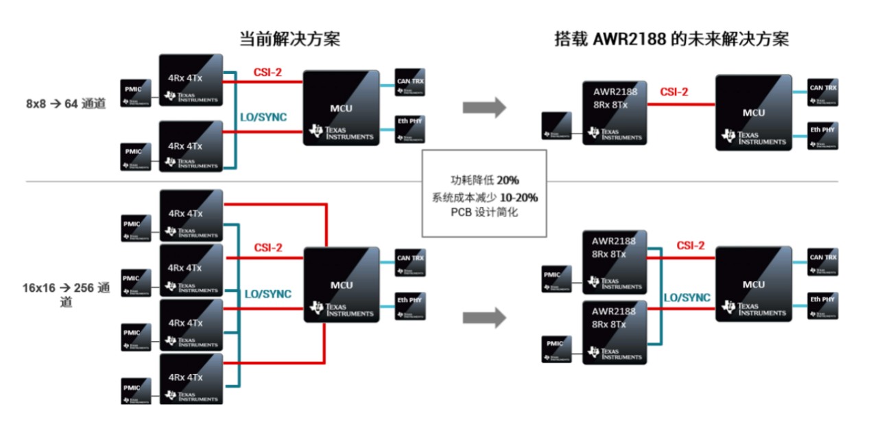對(duì)于工程師而言,AWR2188 顯著簡(jiǎn)化了高分辨率雷達(dá)的設(shè)計(jì)流程。在傳統(tǒng)的 8x8 天線配置方案中,通常需要兩顆獨(dú)立的 4x4 芯片級(jí)聯(lián);而 16x16 配置則需四顆芯片。采用 AWR2188,僅需單顆芯片即可實(shí)現(xiàn) 8x8 配置,16x16 配置也僅需兩顆芯片。 這種集成度的提升帶來(lái)了直接的經(jīng)濟(jì)效益:電路板設(shè)計(jì)大幅簡(jiǎn)化,系統(tǒng)功耗降低 20%,系統(tǒng)成本減少最多 20%。此外,由于減少了對(duì)外部芯片同步處理及復(fù)雜 PCB 布線的需求,研發(fā)成本和工程負(fù)擔(dān)也隨之降低。