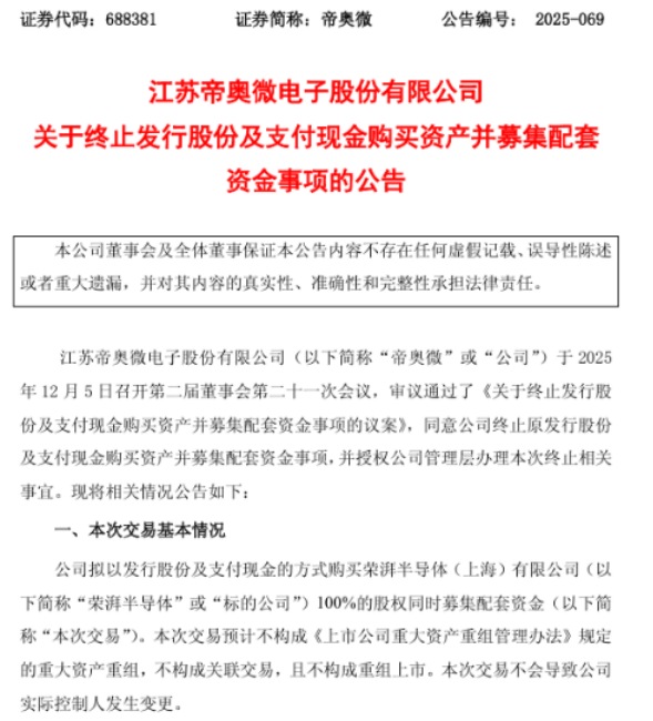 再看江蘇帝奧微電子股份有限公司(以下簡稱“帝奧微”)終止收購榮湃半導(dǎo)體(上海)有限公司(以下簡稱“榮湃半導(dǎo)體”)案例:2025年12月6日,帝奧微終止對榮湃半導(dǎo)體100%股權(quán)的收購,原本雙方同屬高性能模擬芯片賽道,業(yè)務(wù)存在高度互補(bǔ)性,帝奧微擅長信號鏈和電源管理芯片,榮湃半導(dǎo)體則在隔離芯片領(lǐng)域率先實(shí)現(xiàn)國產(chǎn)化,但最終因“交易方案、價(jià)格及業(yè)績承諾等核心條款未達(dá)成一致”而擱淺。