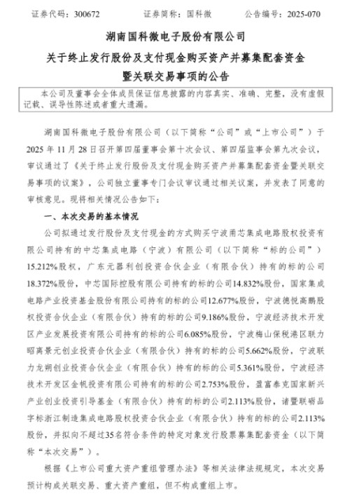 以湖南國科微電子股份有限公司(以下簡稱“國科微”)終止收購中芯集成電路(寧波)有限公司(以下簡稱“中芯寧波”)為例:2025年11月28日,采用無晶圓廠半導(dǎo)體公司商業(yè)模式的國科微宣布終止收購晶圓代工企業(yè)中芯寧波94.366%股權(quán)。中芯寧波專注于特色工藝代工,國科微原計(jì)劃通過此次交易,推動(dòng)其在高端濾波器、MEMS特種工藝代工等領(lǐng)域的布局,拓展智能手機(jī)、智能網(wǎng)聯(lián)汽車等下游市場,但因“交易相關(guān)事項(xiàng)無法在預(yù)計(jì)時(shí)間內(nèi)達(dá)成一致”,經(jīng)審慎評估后終止。