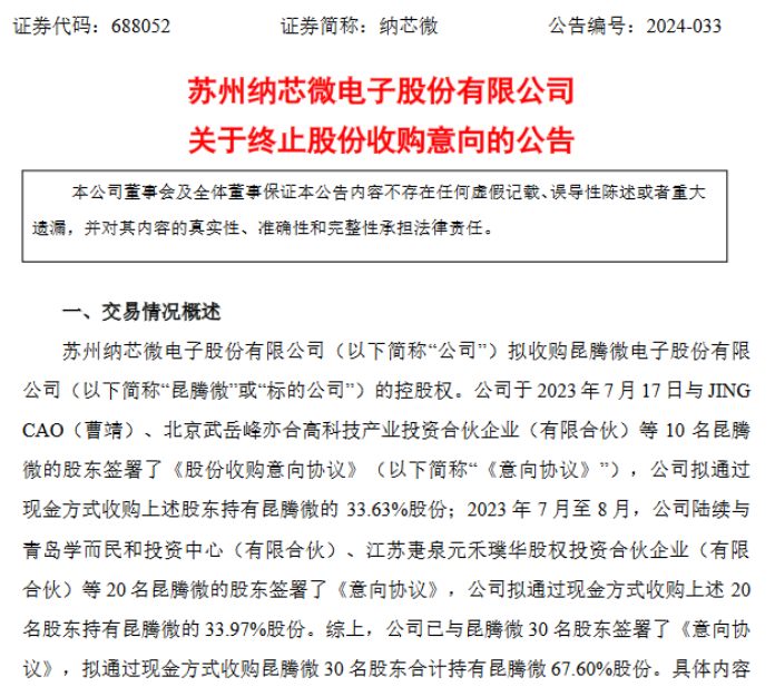 我們先來看一個(gè)更早的案例:2024年8月9日,蘇州納芯微電子股份有限公司(以下簡稱“納芯微”)發(fā)布公告,籌劃逾一年、擬以現(xiàn)金收購昆騰微電子股份有限公司(以下簡稱“昆騰微”)67.60%股份(整體估值不超過15億元)的收購計(jì)劃正式終止。公告表示:“外部市場環(huán)境變化導(dǎo)致交易各方未能達(dá)成最終共識”,核心還是如何進(jìn)行動(dòng)態(tài)估值這一并購領(lǐng)域的痛點(diǎn)。