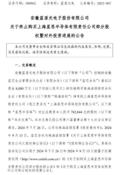 12月11日,安徽藍(lán)盾光電股份有限公司(以下簡稱“藍(lán)盾光電”)旗下安徽藍(lán)芯企業(yè)管理合伙企業(yè)(以下簡稱“藍(lán)芯管理”)終止以8000萬元現(xiàn)金收購珠海洛恒投資合伙企業(yè)(以下簡稱“珠海洛恒”)持有的上海星思半導(dǎo)體(以下簡稱“星思半導(dǎo)體”)部分股權(quán)(對應(yīng)注冊資本78.28萬元)。其公告稱:但鑒于公司自身情況和星思半導(dǎo)體情況,為控制投入并減少對外投資對公司的影響,維護(hù)公司及全體股東尤其是中小股東的利益,綜合考慮各種相關(guān)因素,公司及藍(lán)芯合伙經(jīng)慎重考慮并與珠海洛恒共同商議后,決定終止本次交易。