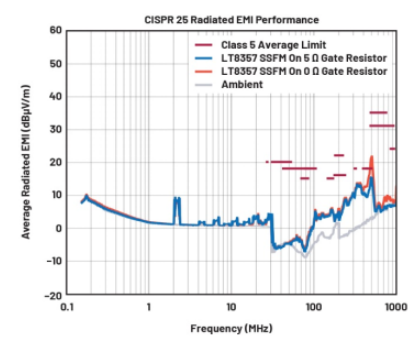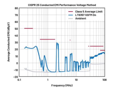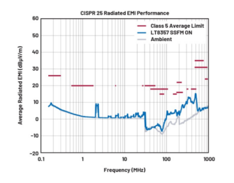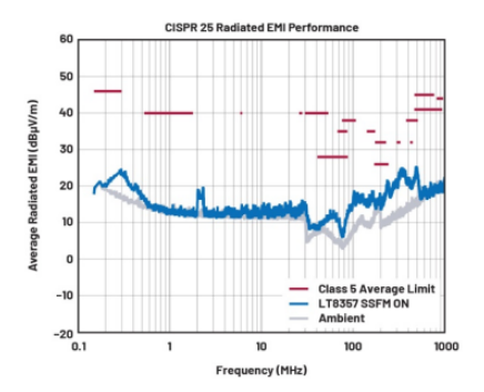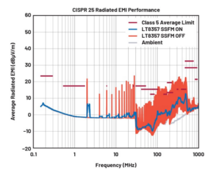 在某些情況下,盡管做了努力,但基波頻率和諧波仍可能會(huì)超出限值。為解決這一問題,ADI推出了具有SSFM特性的升壓控制器。SSFM特性對于通過CISPR 25輻射標(biāo)準(zhǔn)至關(guān)重要。利用三角擴(kuò)頻技術(shù),這款I(lǐng)C可將開關(guān)頻率智能地?cái)U(kuò)展至高于設(shè)定頻率19%。這種擴(kuò)頻技術(shù)有助于降低最小和最大頻率下的輻射峰值。圖11顯示了內(nèi)置SSFM功能如何影響輻射頻譜,從而幫助降低輻射以滿足CISPR標(biāo)準(zhǔn)。