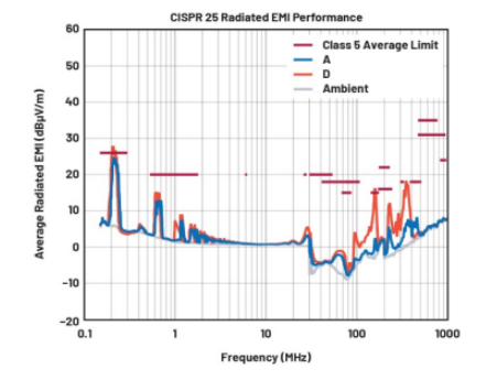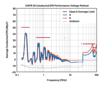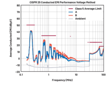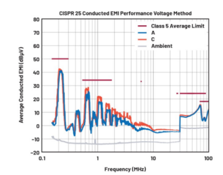 2 MHz開關(guān)頻率還帶來了另一個(gè)重要優(yōu)勢。CISPR 25施加了從530 kHz到1.8 MHz的限制,被稱為MW頻段,其中包含AM射頻頻段。為了符合規(guī)定,建議避免將開關(guān)頻率設(shè)置在此范圍內(nèi)。通過使用2 MHz的開關(guān)頻率,能夠完全避開MW頻段,為實(shí)現(xiàn)合規(guī)提供一些裕度。輻射圖的基波頻率在2 MHz時(shí)精確對準(zhǔn),后續(xù)諧波則出現(xiàn)在更高的頻率上。這樣便無需使用龐大的低頻濾波器來衰減低于頻率CISPR下限的輻射。