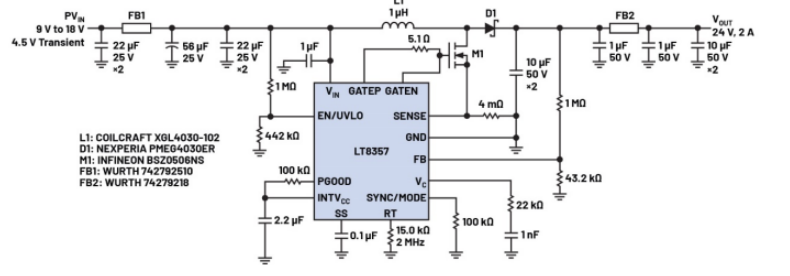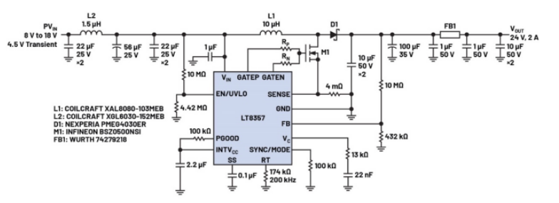 隨著器件不斷縮小并將更多功能和功率要求整合到更小的面積中,對減少電路板面積的需求日益增長,首當(dāng)其沖的就是電源。電感通常是最大的元件,在減少電路板面積的過程中成為一大難題。有充分證據(jù)表明,在開關(guān)轉(zhuǎn)換器中,所需電感與開關(guān)頻率成反比。例如,對于200 kHz,如果設(shè)計(jì)需要10 μH電感,那么在2 MHz時(shí),相同功率要求將僅需1 μH電感。LT8357提供高達(dá)2 MHz的開關(guān)頻率靈活性,允許顯著減小電感尺寸,從而縮小開關(guān)節(jié)點(diǎn)。尺寸縮小可能有利于降低輻射。