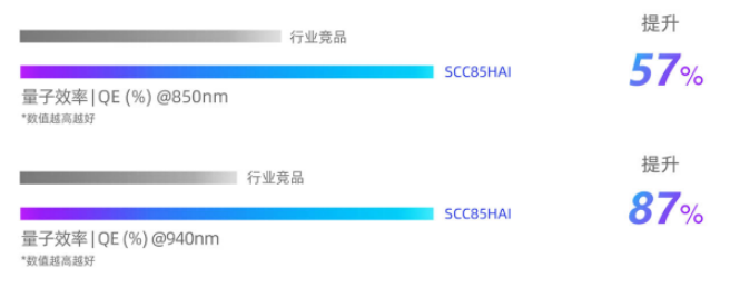 SCC85HAI搭載SFCPixel®專利技術和Lightbox IR®近紅外增強技術,實現(xiàn)了可見光與近紅外波段下感度的顯著提升。SCC85HAI在520nm波段下的峰值量子效率(peak QE)高達81%,能夠讓監(jiān)控攝像頭在陰天、傍晚等光線不足環(huán)境下的成像更明亮清晰。與行業(yè)競品相比,SCC85HAI在850nm和940nm波段下的峰值量子效率(peak QE)分別大幅提升約57%和87%,能在夜間低照度場景中為攝像頭捕捉到近紅外清晰影像。并且,SCC85HAI優(yōu)異的近紅外成像表現(xiàn),還可幫助監(jiān)控攝像頭有效減少紅外補光燈的配置數(shù)量,降低設備運行功耗與發(fā)熱。