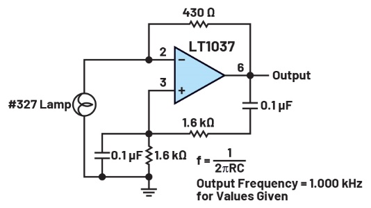 增益控制通過(guò)白熾燈泡實(shí)現(xiàn)(與Bill Hewlett配置中的情況一致)。白熾燈泡的電阻隨功耗增加而增大,根據(jù)粗略經(jīng)驗(yàn)法則,其熱態(tài)電阻通常約為冷態(tài)電阻的10倍。圖中所示的#327型燈泡,工作電壓為28V,工作電流為40mA,因此熱態(tài)電阻約為700Ω,冷態(tài)電阻約為70Ω,這一數(shù)值與多只該型號(hào)燈泡的實(shí)際測(cè)量結(jié)果相符。若要實(shí)現(xiàn)3倍的同相增益,燈泡電阻需為反饋電阻的一半,即大約215Ω。