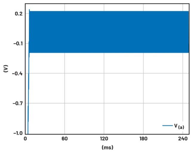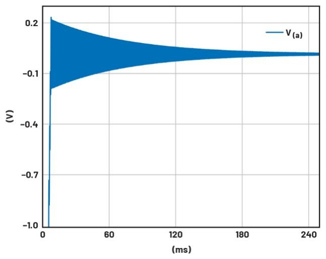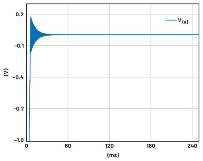 暫時(shí)忽略V1。需注意,該仿真啟動(dòng)時(shí),所有電壓均為零。此時(shí)電路沒(méi)有理由偏離零值,只會(huì)始終保持零電壓狀態(tài)。V1的作用是在仿真剛開(kāi)始時(shí),通過(guò)向增益級(jí)提供一個(gè)階躍信號(hào)來(lái)啟動(dòng)電路運(yùn)行,隨后它會(huì)逐漸回零,且不再對(duì)電路的運(yùn)行產(chǎn)生影響。運(yùn)行仿真并探測(cè)輸出節(jié)點(diǎn),得到的結(jié)果應(yīng)與圖6所示相近。