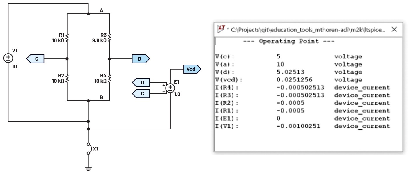 請(qǐng)注意,該電橋初始狀態(tài)為非平衡狀態(tài),因此在Vcd端會(huì)產(chǎn)生一個(gè)數(shù)值較小但不為零的電壓(此處采用增益為1的壓控電壓源,這種方式能便捷地測(cè)量?jī)蓚€(gè)節(jié)點(diǎn)間的電壓差,且測(cè)量結(jié)果可直接在仿真輸出中顯示)。可嘗試修改R3的阻值進(jìn)行實(shí)驗(yàn):取值為10kΩ時(shí),電橋應(yīng)處于平衡狀態(tài),此時(shí)輸出電壓為零。還可嘗試將R1和R2的阻值減小至1kΩ,看看這是否會(huì)對(duì)輸出電壓產(chǎn)生影響。
