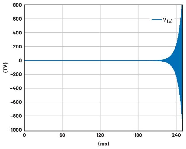 作為“仿真可模擬現(xiàn)實(shí)中不可能出現(xiàn)的場(chǎng)景”的最后一個(gè)例證,按圖9所示將增益設(shè)為3.03(即比臨界值高1%,類(lèi)似于在實(shí)際電路中采用了1%的電阻,剛好偏向增益較高的一側(cè)可能出現(xiàn)的情況),然后運(yùn)行仿真。