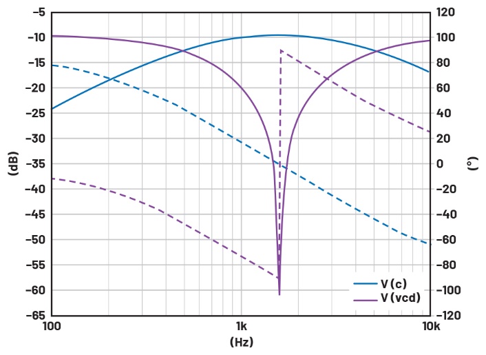 接下來(lái)探索文氏電橋的工作原理,其中包含與頻率相關(guān)的元件。在LTspice中打開(kāi)basic_wein_bridge.asc仿真文件(如圖3所示)。該仿真設(shè)置為交流掃描(AC sweep)模式,頻率范圍從100Hz到10kHz,仿真結(jié)果如圖4所示。請(qǐng)注意,若采用直流電源為電橋供電,會(huì)產(chǎn)生一個(gè)較為明顯的輸出;經(jīng)過(guò)初始瞬態(tài)過(guò)程后,節(jié)點(diǎn)C會(huì)穩(wěn)定在接地電位,而節(jié)點(diǎn)D則會(huì)達(dá)到電源電壓的1/3。運(yùn)行仿真并探測(cè)節(jié)點(diǎn)C,即電橋電抗臂的輸出端。可觀察到響應(yīng)曲線(xiàn)呈現(xiàn)平緩的峰值(“駝峰”狀),峰值位置略低于2kHz。接著探測(cè)Vcd端??捎^察到響應(yīng)曲線(xiàn)出現(xiàn)極其尖銳的零值點(diǎn),通過(guò)這一特征可輕松定位精確諧振頻率為1.59kHz。